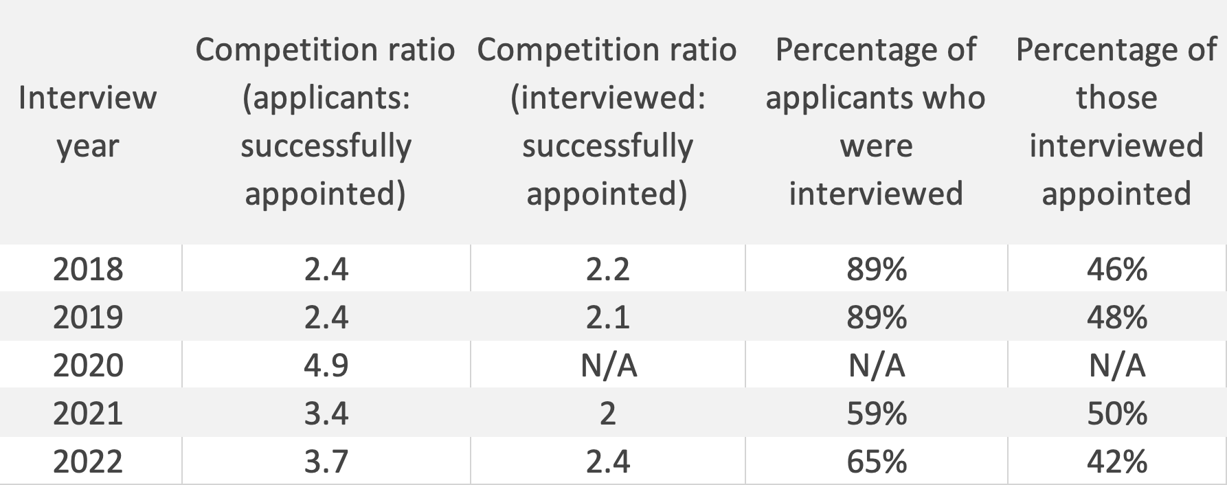 Each deanery has a slightly different competition ratio with the more popular deaneries usually oversubscribed. The below table shows the number of jobs available per year and the average national competition ratios.